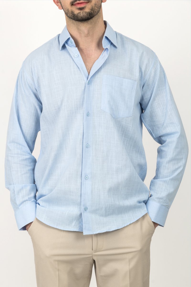 Rahat formu ve nefes alan %100 pamuk keten dokusuyla yazın favorisi olmaya aday klasik kesim mavi gömlek, günlük ve şık kombinlerde yüksek konfor sunar.